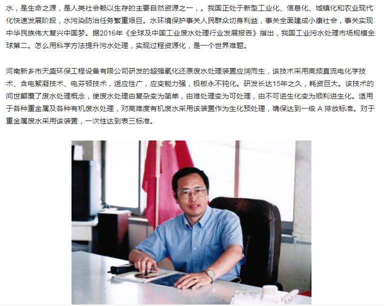 中國(guó)高新技術(shù)網(wǎng)發(fā)布:《關(guān)注:解碼科技創(chuàng)新》——新鄉(xiāng)市天盛環(huán)?!俺瑥?qiáng)氧化還原廢水處理技術(shù)”